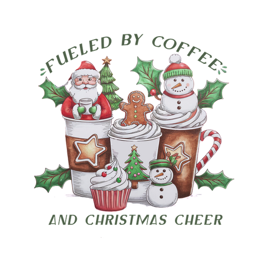A festive illustration featuring coffee cups, Santa, and holiday treats, celebrating the joy of Christmas cheer and caffeine. dtf prints