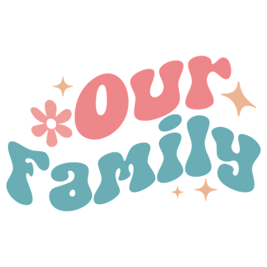 A colorful and playful design featuring the words "Our Family" with whimsical stars and flower accents.dtf regular iron
