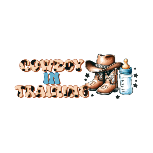 A playful "Cowboy in Training" design featuring cowboy boots, a hat, and a baby bottle, perfect for little cowboys. dtf transfers