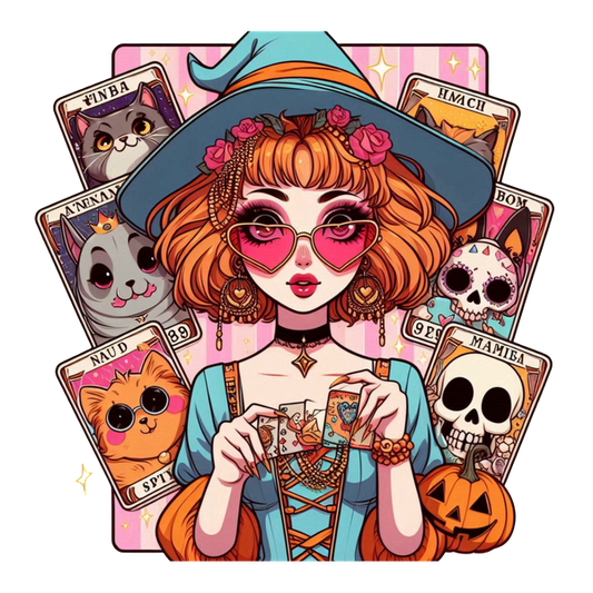Regular price From £0.74 GBPRegular priceUnit price / per£2.38 GBPSale price From £0.74 GBPA colorful illustration of a witchy girl in a blue outfit and pink sunglasses, surrounded by playful tarot cards featuring cats and skulls.dtf regular iron