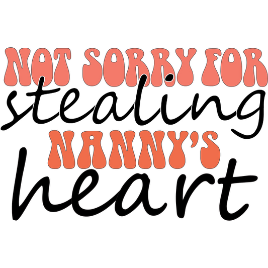 Fun and playful text design reading "Not Sorry for Stealing Nanny's Heart," perfect for a lighthearted gift or decor. heat press transfers