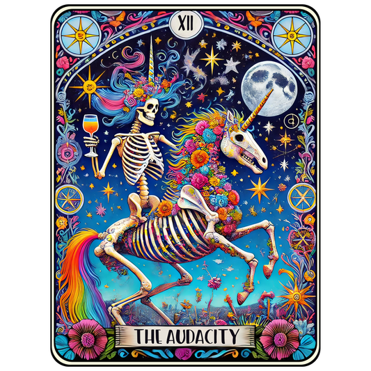 A vibrant, whimsical tarot card titled "The Audacity," featuring a skeleton riding a colorful unicorn amidst a starry night. dtf prints