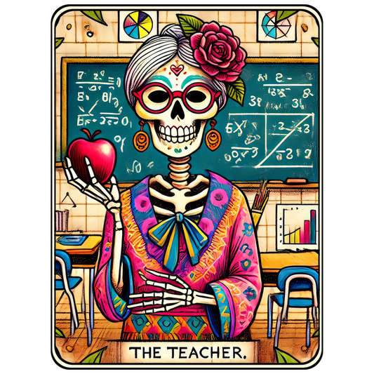 Regular price From £0.74 GBPRegular priceUnit price / per£2.38 GBPSale price From £0.74 GBPA vibrant skeleton teacher holds an apple in a colorful traditional dress, set against a classroom backdrop with a chalkboard. heat press transfers