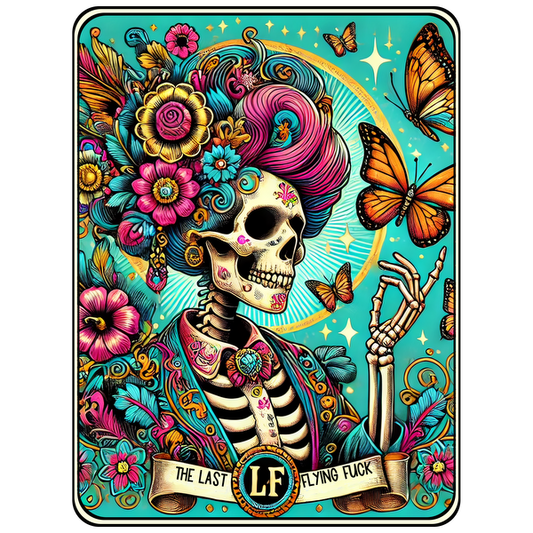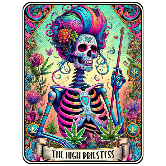 Regular price From £0.74 GBPRegular priceUnit price / per£2.38 GBPSale price From £0.74 GBPA vibrant, colorful illustration of a skeleton dubbed "The High Priestess," adorned with flowers and iconic symbols. dtf transfers