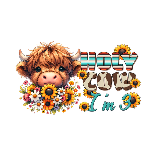 Celebrate a special birthday with this fun "Holy Cow, I'm 3" design featuring an adorable Highland cow surrounded by vibrant flowers. dtf transfers