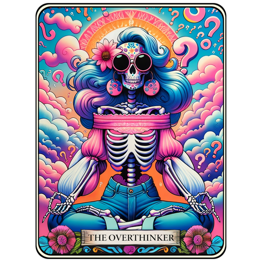 Regular price From £0.74 GBPRegular priceUnit price / per£2.38 GBPSale price From £0.74 GBPA vibrant, psychedelic illustration of a skeleton named "The Overthinker," adorned with flowers and surrounded by colorful clouds and question marks. dtf transfers