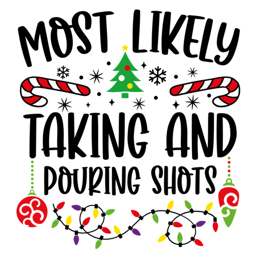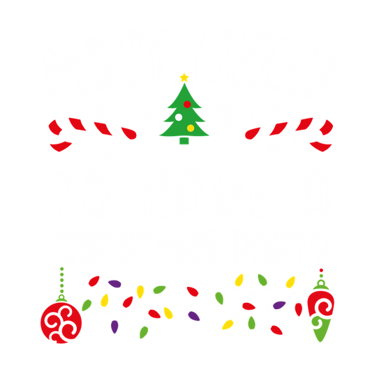 Regular price From £0.74 GBPRegular priceUnit price / per£2.37 GBPSale price From £0.74 GBPA festive holiday design featuring a "Most Likely" title, decorated with candy canes, a Christmas tree, and colorful lights.DTF Transfers dtf prints