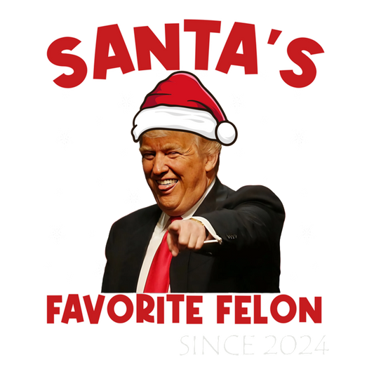 This festive graphic features a humorous design with a Santa hat, proclaiming "Santa's Favorite Felon Since 2024" against a snowy background.DTF Transfersdtf regular iron