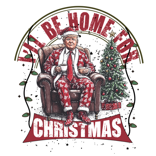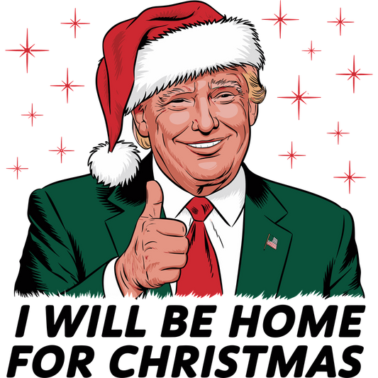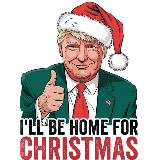 Festive design featuring a figure in a bright red suit and Santa hat, with the White House backdrop and "I'll Be Home for Christmas" text.DTF Transfersdtf regular irondtf regular iron
