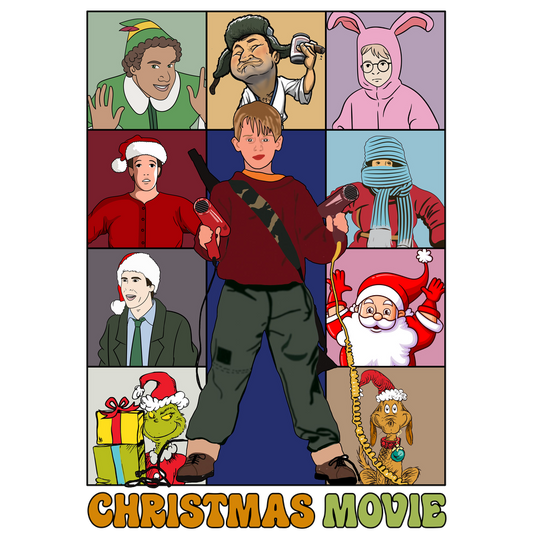 Regular price From £0.74 GBPRegular priceUnit price / per£2.37 GBPSale price From £0.74 GBPFestively themed illustration featuring a boy with toy guns surrounded by popular holiday characters, celebrating the spirit of Christmas movies.DTF Transfers dtf prints