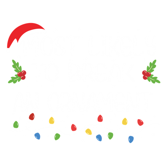 A fun and festive graphic proclaiming "Most Likely to Break an Ornament," adorned with holiday lights and holly accents.DTF Transfers dtf transfers heat press transfers