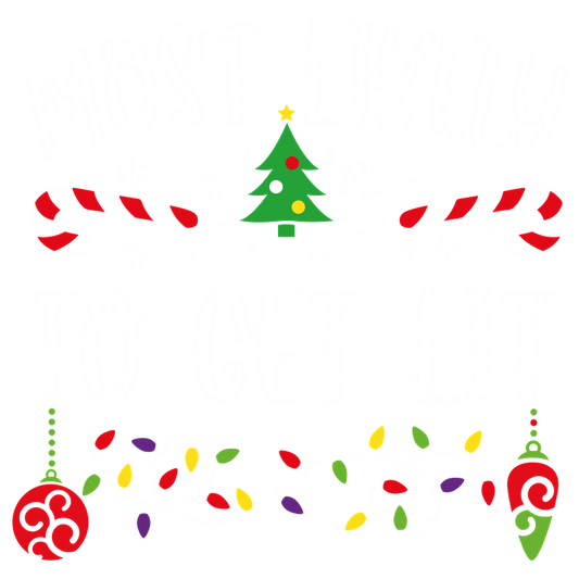 A playful holiday graphic featuring the phrase "Most Likely To Get Lit," adorned with a Christmas tree, candy canes, snowflakes, and colorful lights.DTF Transfers dtf prints