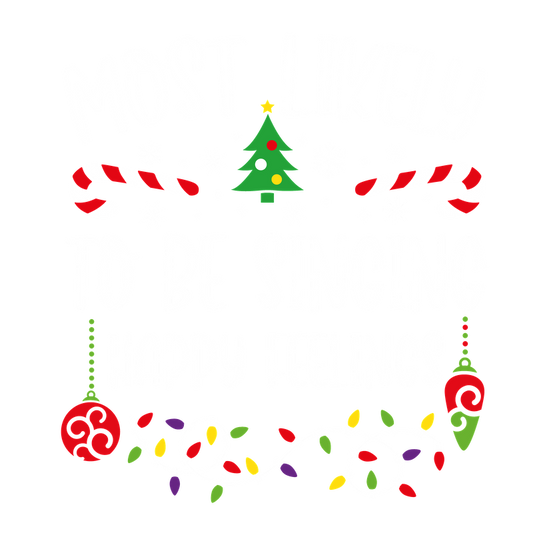 Regular price From £0.74 GBPRegular priceUnit price / per£2.37 GBPSale price From £0.74 GBPBright and festive graphic featuring the phrase "Most Likely to Be Singing Happy Feelings," adorned with Christmas decorations and colorful lights.DTF Transfers heat press transfers dtf transfers