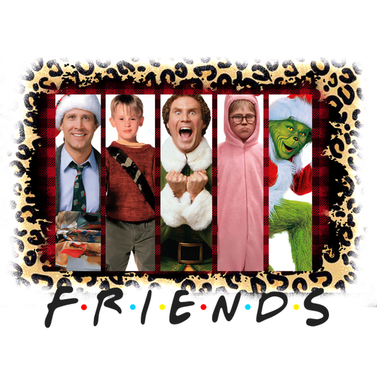 A vibrant design featuring playful characters in festive attire, set against a fun animal print background with the text "FRIENDS."DTF Transfers dtf prints