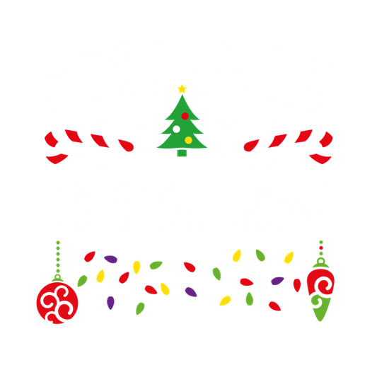 A festive design featuring the playful phrase "Most Likely to Stay Home," surrounded by candy canes, snowflakes, and holiday lights.DTF Transfers dtf prints