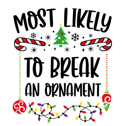 Celebrate the holidays with this fun and playful graphic featuring the phrase "Most Likely to Break an Ornament," adorned with festive decorations!DTF Transfers dtf transfers heat press transfers