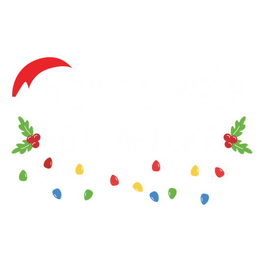 A festive design featuring the playful text "Most Likely to Stay Home," accented with holiday decorations like Santa hats and colorful lights.DTF Transfers dtf prints