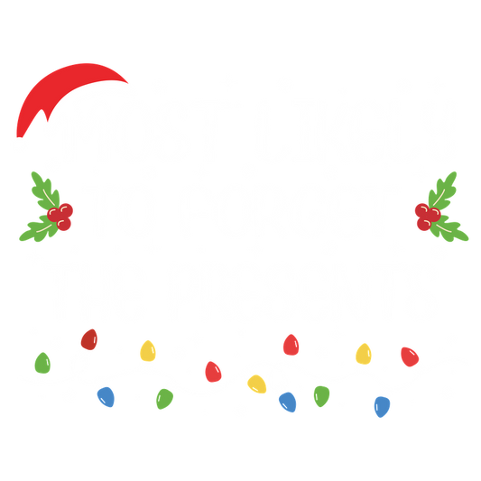 Fun and festive design featuring the playful phrase "Most Likely to Forget the Presents," adorned with holiday decor elements.DTF Transfers dtf prints