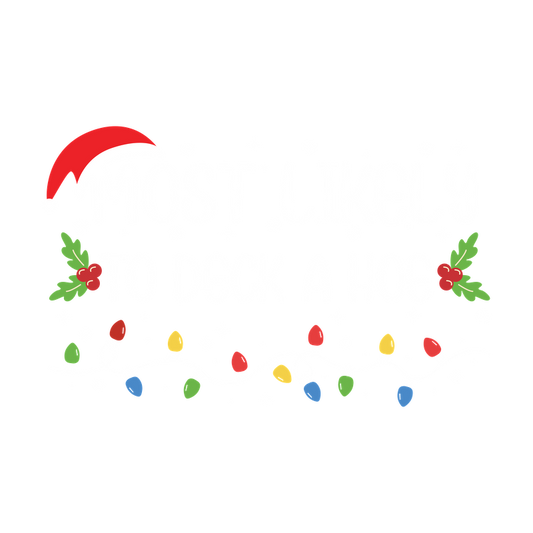 Regular price From £0.74 GBPRegular priceUnit price / per£2.37 GBPSale price From £0.74 GBPFestive graphic featuring the playful phrase "Most Likely to Deck a H***," adorned with Christmas lights and holly accents.DTF Transfers dtf prints