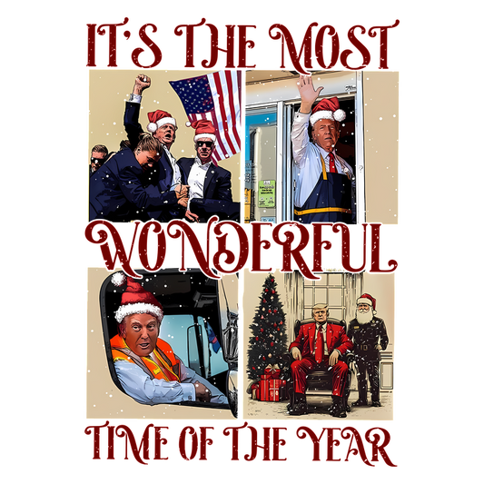 Festive graphic featuring a person in a Santa hat with the phrase "It's the Most Wonderful Time of the Year" and holiday motifs.DTF Transfers dtf prints