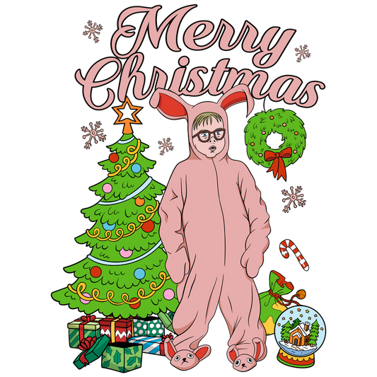 Cozy up in this playful pink bunny onesie amidst a festive Christmas scene, complete with a decorated tree and gifts.DTF Transfersdtf regular iron dtf prints