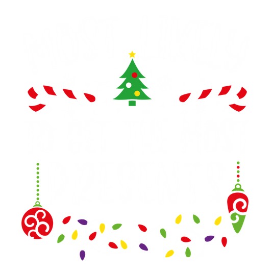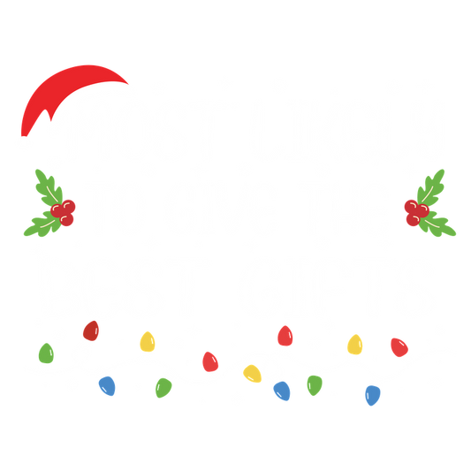 Celebrate the holidays with this festive design featuring the phrase "Most Likely to Give the Best Gifts" amidst Christmas lights and decorations!DTF Transfersdtf regular iron dtf transfers