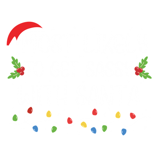 Playfully festive, this design features the phrase "Most Likely to Get Sassy with Santa," adorned with holiday motifs and lights.DTF Transfersdtf regular irondtf regular iron