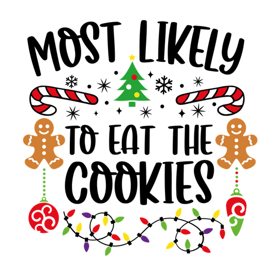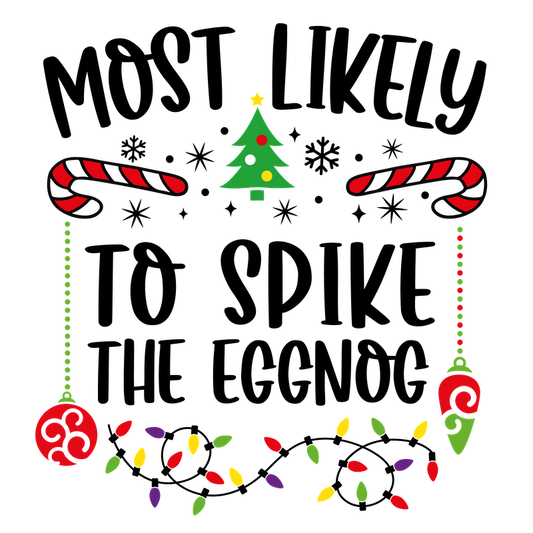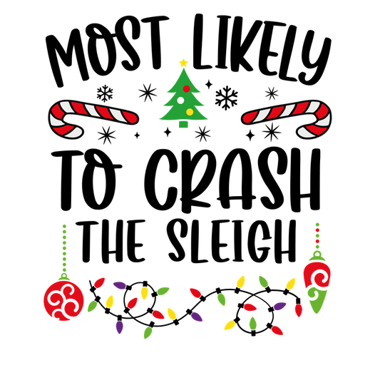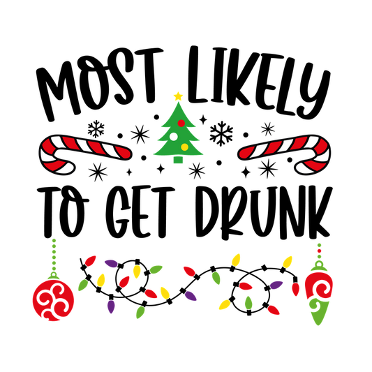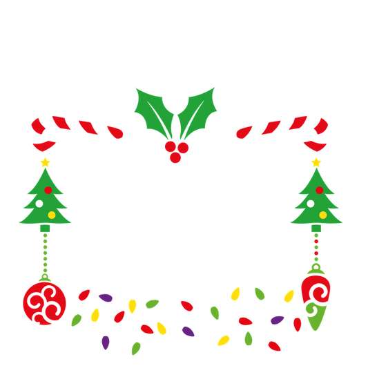 Celebrate the holiday spirit with this fun "Most Likely to Break an Ornament" design featuring festive trees, candy canes, and lights!DTF Transfersdtf regular iron heat press transfers