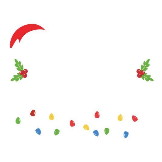 Regular price From £0.74 GBPRegular priceUnit price / per£2.37 GBPSale price From £0.74 GBPFun and festive graphic featuring the playful phrase "Most Likely to Re-Gift Their Present" surrounded by holiday decorations.DTF Transfers dtf transfers heat press transfers