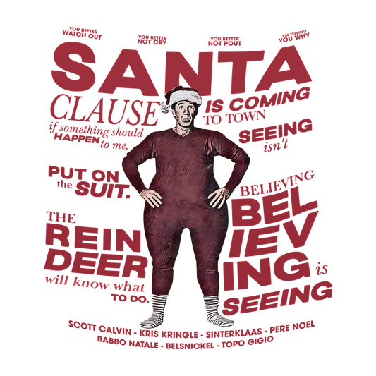A whimsical design featuring a character in a red outfit with playful text about Santa Claus and holiday spirit.DTF Transfers heat press transfers heat press transfers heat press transfers