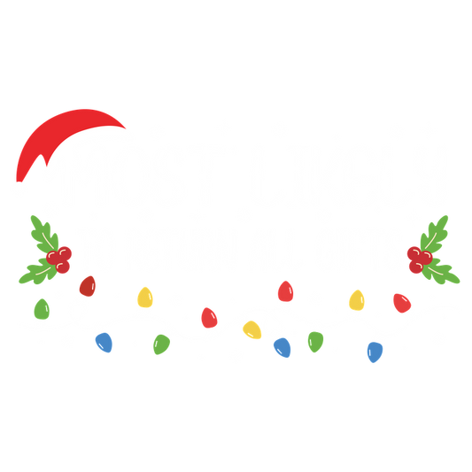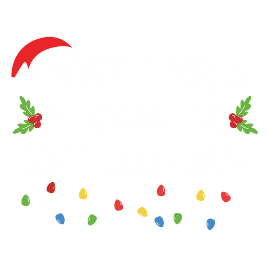 Humorous holiday design featuring the phrase "Most Likely to Return All Gifts," decorated with festive lights and holly.DTF Transfers dtf transfers dtf transfers