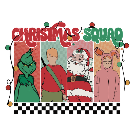 Celebrate the holiday spirit with the quirky "Christmas Squad," featuring iconic characters in festive attire and cheerful colors!DTF Transfers heat press transfersdtf regular iron