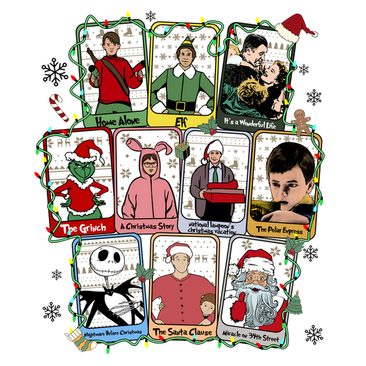 Celebrate the holiday spirit with this festive design featuring iconic scenes from classic Christmas movies, adorned with lights and decorations.DTF Transfersdtf regular irondtf regular iron