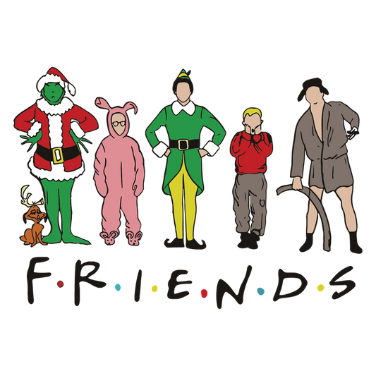 A festive and whimsical design featuring iconic characters celebrating holidays, complete with a playful "F.R.I.E.N.D.S" theme.DTF Transfersdtf regular iron heat press transfers