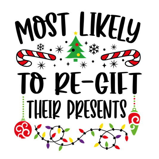 Fun and festive graphic featuring the playful phrase "Most Likely to Re-Gift Their Present" surrounded by holiday decorations.DTF Transfers dtf transfers heat press transfers