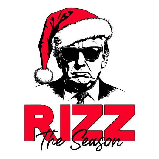 A bold graphic featuring a stylized figure in a red Santa hat, paired with the bold title "RIZZ the Savior" in striking red.DTF Transfersdtf regular irondtf regular iron