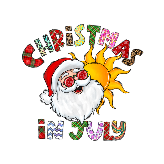Celebrate "Christmas in July" with a fun illustration of Santa wearing sunglasses, surrounded by a bright sun and colorful text!DTF Transfersdtf regular iron