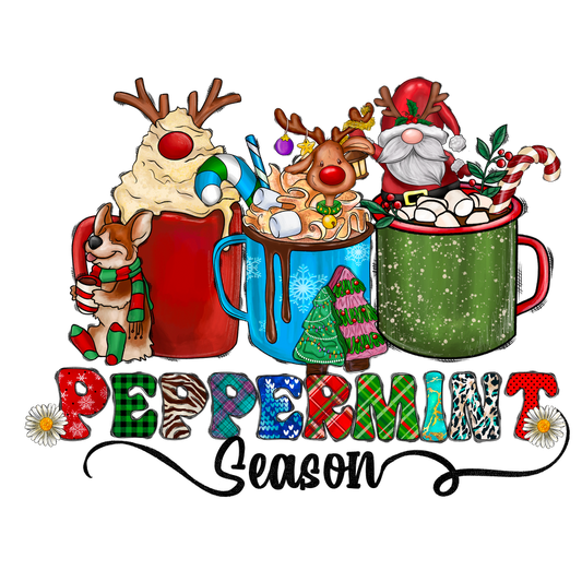 Cozy and festive, this illustration features colorful mugs filled with treats, playful holiday characters, and whimsical lettering that spells "Peppermint."DTF Transfers dtf prints