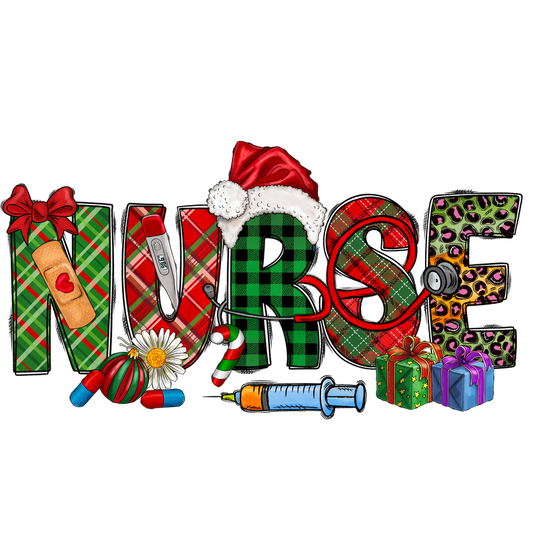 Celebrate the nursing profession with this festive, colorful design that features playful letters adorned with holiday symbols and medical tools!DTF Transfers heat press transfers dtf transfers
