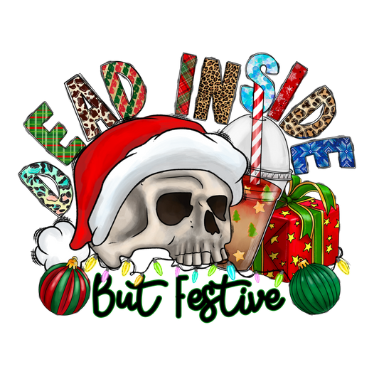 A whimsical skull wearing a Santa hat, surrounded by festive decorations and the phrase "Dead Inside but Festive," capturing a humorous holiday spirit.DTF Transfers heat press transfers heat press transfers