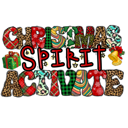 Embrace the festive cheer with this vibrant design that reads "Christmas Spirit Activate" in colorful patterns and holiday motifs.DTF Transfers dtf prints
