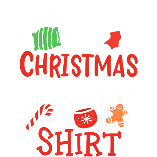 Festively designed shirt with the phrase "This is My Christmas Pajamas Shirt," featuring holiday-themed graphics like a stocking, gingerbread man, and candy cane.DTF Transfers dtf transfers dtf prints