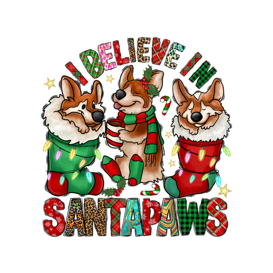 This festive design features three cheerful corgis in holiday attire, celebrating with the playful phrase "I Believe in Santapaws."DTF Transfersdtf regular iron