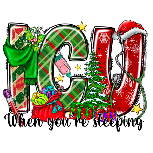 A festive and playful design featuring "ICU" adorned with Christmas elements like a tree, gifts, and medical items, captioned "When you're sleeping."DTF Transfers dtf transfers dtf prints
