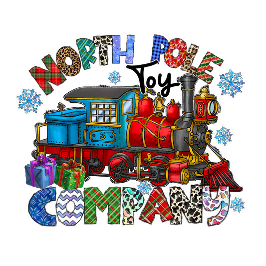 Dive into the festive spirit with this colorful illustration featuring a whimsical North Pole toy train surrounded by playful snowflakes and gifts!DTF Transfers dtf prints