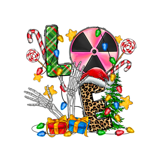 A playful holiday-themed design featuring a skeleton wearing a Santa hat, surrounded by candy canes, Christmas lights, and colorful gifts.DTF Transfers dtf transfersdtf regular iron