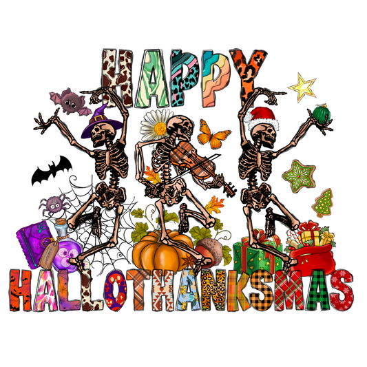 A whimsical and festive design featuring dancing skeletons celebrating Halloween, Thanksgiving, and Christmas with vibrant decorations and gifts.DTF Transfers dtf prints