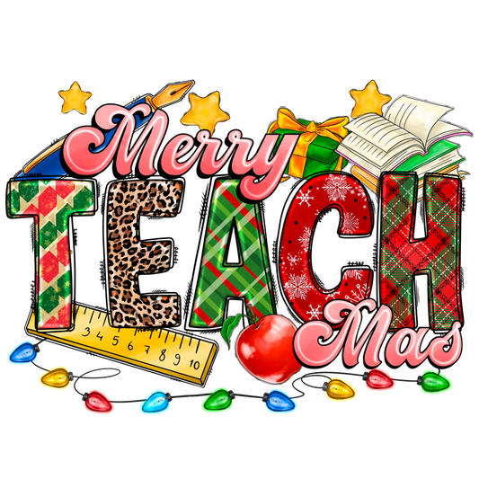 Celebrate the season with a vibrant "Merry Teach Mas" design, featuring colorful letters, festive decorations, and playful school-themed elements!DTF Transfers dtf prints