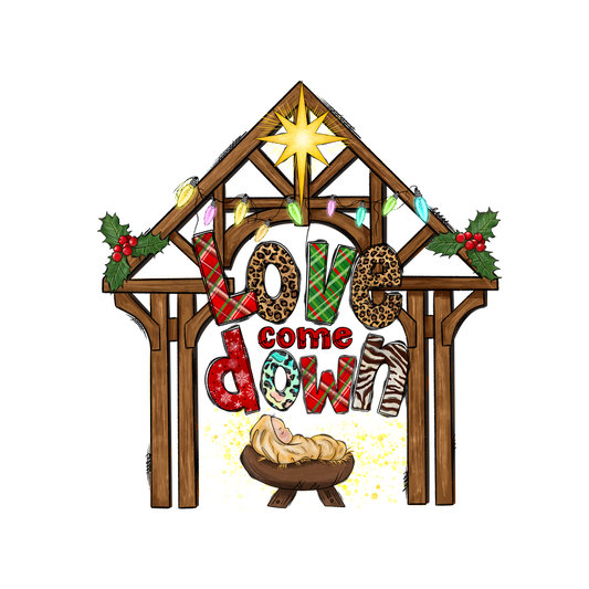 A vibrant Christmas scene featuring a wooden nativity structure adorned with colorful lights, holiday greenery, and the phrase "Love come down."DTF Transfers dtf prints