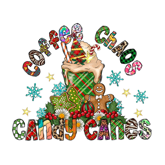 Festive illustration featuring a whimsical coffee cup surrounded by decorative elements like candy canes and gingerbread, celebrating holiday cheer.DTF Transfers dtf transfers
